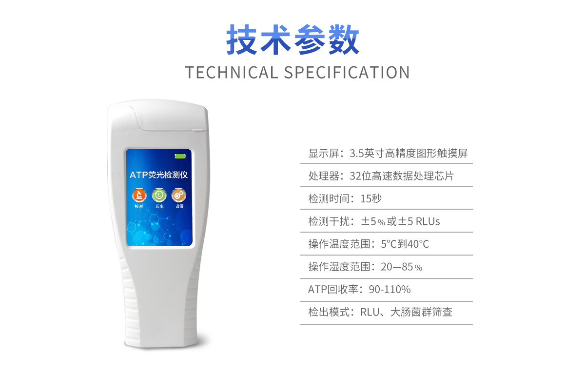 該設(shè)備采用生物化學(xué)反應(yīng)方法檢測(cè)ATP含量,潔凈度檢測(cè)儀基于螢火蟲發(fā)光原理,利用“熒光素酶—熒光素體系”快速檢測(cè)三磷酸腺苷(ATP)。ATP拭子含有可以裂解細(xì)胞膜的試劑,能將細(xì)胞內(nèi)ATP釋放出來,與試劑中含有的特異性酶發(fā)生反應(yīng),產(chǎn)生光,再用熒光照度計(jì)檢測(cè)發(fā)光值,微生物的數(shù)量與發(fā)光值成正比,由于所有生物活細(xì)胞中含有恒量的ATP,所以ATP含量可以清晰地表明樣品中微生物與其他生物殘余的多少,用于判斷衛(wèi)生狀況。