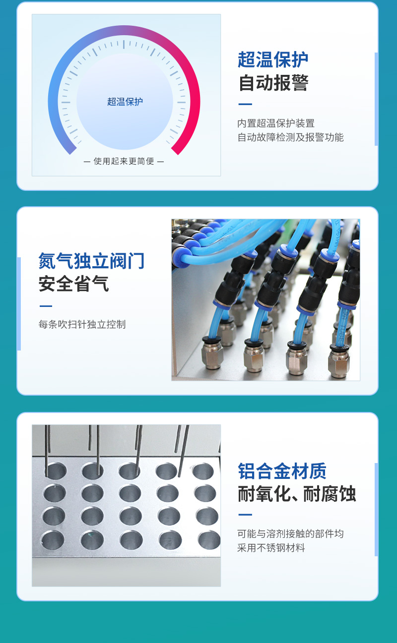 3、氮吹儀有36個(gè)氣道控制開關(guān),節(jié)約氣體,每根吹氣針的位置可獨(dú)立改變吹掃位置,使之適用不同的樣品容器及不同的樣品位置
