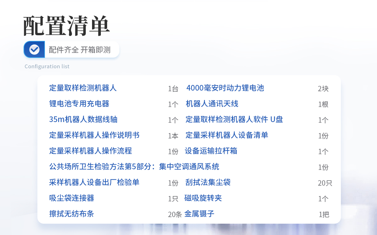 定量取樣檢測(cè)機(jī)器人:1臺(tái) 4000毫安時(shí)動(dòng)力鋰電池:2塊 鋰電池專(zhuān)用充電器:1個(gè) 機(jī)器人通訊天線(xiàn):1根 35m機(jī)器人數(shù)據(jù)線(xiàn)軸:1個(gè) 定量取樣檢測(cè)機(jī)器人軟件 U盤(pán):1個(gè) 定量采樣機(jī)器人操作說(shuō)明書(shū):1本 定量采樣機(jī)器人設(shè)備清單:1份 定量采樣機(jī)器人操作流程:1份 公共場(chǎng)所衛(wèi)生檢驗(yàn)方法第5部分:集中空調(diào)通風(fēng)系統(tǒng):1份 采樣機(jī)器人設(shè)備出廠(chǎng)檢驗(yàn)單:1份 刮拭法集塵袋 :20只 吸塵袋連接器 :1只 磁吸旋轉(zhuǎn)夾:1個(gè) 擦拭無(wú)紡布條 :20條 金屬鑷子:1把 設(shè)備運(yùn)輸拉桿箱:1個(gè)