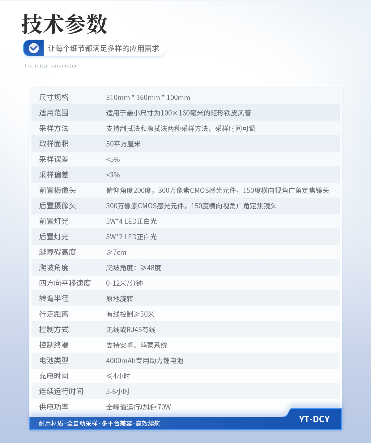 尺寸規(guī)格:310mm * 160mm * 100mm; 適用范圍:適用于*小尺寸為100×160毫米的矩形鐵皮風(fēng)管; 采樣方法:支持刮拭法和擦拭法兩種采樣方法,采樣時(shí)間可調(diào); 取樣面積:50平方厘米; 采樣誤差:<5%; 采樣偏差:<3%; 前置攝像頭:俯仰角度200度,300萬(wàn)像素CMOS感光元件,150度橫向視角廣角定焦鏡頭; 后置攝像頭:300萬(wàn)像素CMOS感光元件,150度橫向視角廣角定焦鏡頭; 前置燈光:5W*4 LED正白光; 后置燈光:5W*2 LED正白光; 越障礙高度:≥7cm; 爬坡角度:≥48度; 四方向平移速度:0-12米/分鐘; 轉(zhuǎn)彎半徑:原地旋轉(zhuǎn); 行走距離:有線(xiàn)控制≥50米; 控制方式:無(wú)線(xiàn)或RJ45有線(xiàn); 控制終端:支持安卓、鴻蒙系統(tǒng); 電池類(lèi)型:4000mAh專(zhuān)用動(dòng)力鋰電池; 充電時(shí)間:≤4小時(shí); 連續(xù)運(yùn)行時(shí)間:5-6小時(shí); 供電功率:全峰值運(yùn)行功耗<70W;