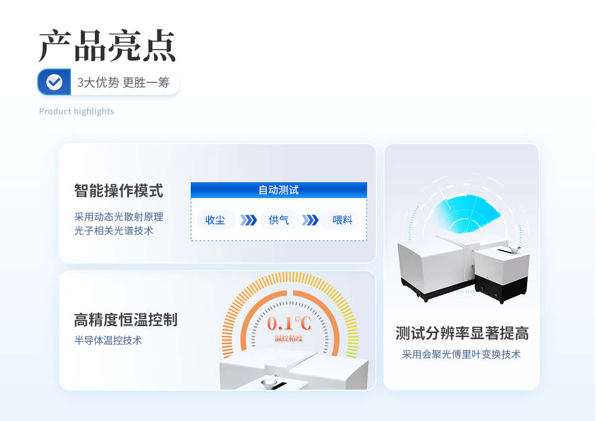| 干濕一體化設計 本款儀器將濕法與干法測試集成于一體,成功解決了干濕法一體化的各項技術問題,能夠實現(xiàn)干濕一鍵切換,使用快捷方便,是**顆粒測試、研究的**選擇。 | 全內置分散系統(tǒng) 使用大功率循環(huán)泵,對管路進行優(yōu)化設計,使整體控制協(xié)調性達到**水平,有效的防止了大顆粒的二次沉淀。 | 無約束自由擬合技術 運用無約束自由擬合技術,粒度分析不受任何函數(shù)的限制,可真實反映顆粒的分布狀態(tài)。 | 光路設計 采用會聚光傅立葉變換技術,使散射光不受透鏡孔徑限制;采用雙譜面光路設計,有效擴大測量范圍至2000微米;雙激光正交光路使用半導體輔助激光器測量側向散射0.0155度至164度,將測量范圍進一步擴展。 |