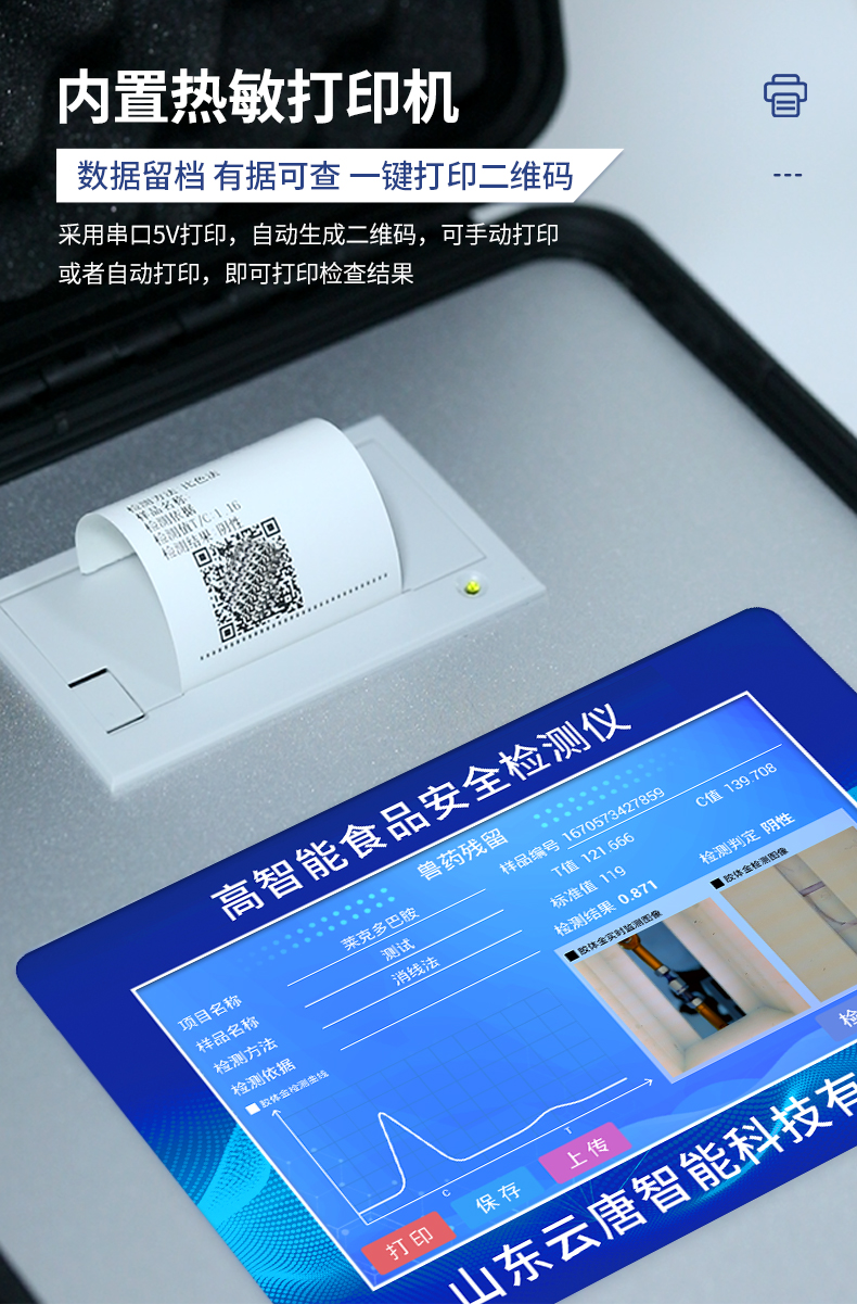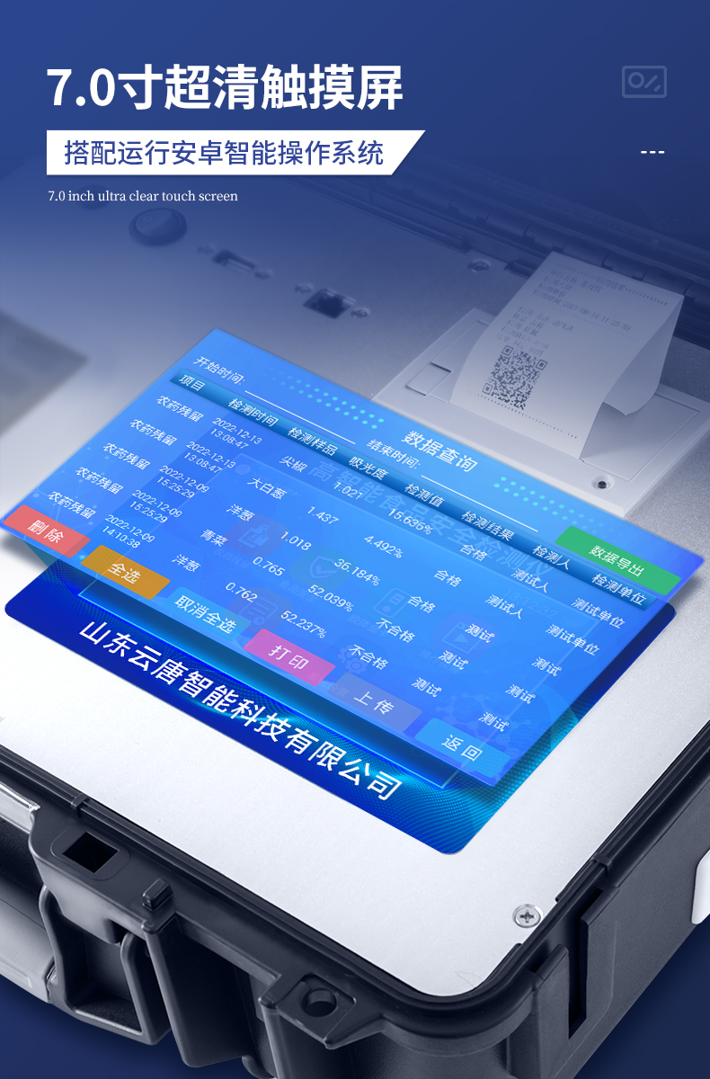 | 該儀器通過光電子技術(shù)對反應(yīng)生成物的反射率進行分析測試,定量或定性分析樣品中待測物的含量。 | 安卓智能操作系統(tǒng),7英寸高靈敏真彩觸摸屏,更加**和人性化操作, | 儀器具有4G無線聯(lián)網(wǎng)、wifi聯(lián)網(wǎng)上傳、GPRS無線遠傳功能,快速上傳數(shù)據(jù)。 | 便攜式儀器,便于現(xiàn)場攜帶操作,主機重量不大于3kg。 | 具有可見光光源,可檢測可見光信號,檢測值0~30000。 | 具有常用打印機數(shù)據(jù)線接口,直接打印結(jié)果;配備USB接口,可連接網(wǎng)絡(luò)。 | 具有多個食品安全檢測項目,開放平臺,可以增減檢測項目。 | 檢測通道:12個檢測通道,可以同時測試多個樣品,每個樣品由程序控制分別獨立工作,不會互相干擾。 | 以模擬反射率的標(biāo)準(zhǔn)片為50%附近時為代表,精密度CV值≤0.8%。 | 供電電源:(220±22V)~50Hz±1Hz,供電電源電壓波動不應(yīng)超過220V AC±10%。 | 內(nèi)置打印機,實時打印檢測結(jié)果。內(nèi)置大容量電池,便于現(xiàn)場執(zhí)法檢測。 | 高靈敏度,高檢測精度,高重復(fù)性精度,掃描式高精度光學(xué)傳感器。 | 機身儲存上萬條檢測結(jié)果,也可以導(dǎo)出儲存。 | 開放端口,可連接監(jiān)管平臺數(shù)據(jù)庫,界面有上傳操作。 |