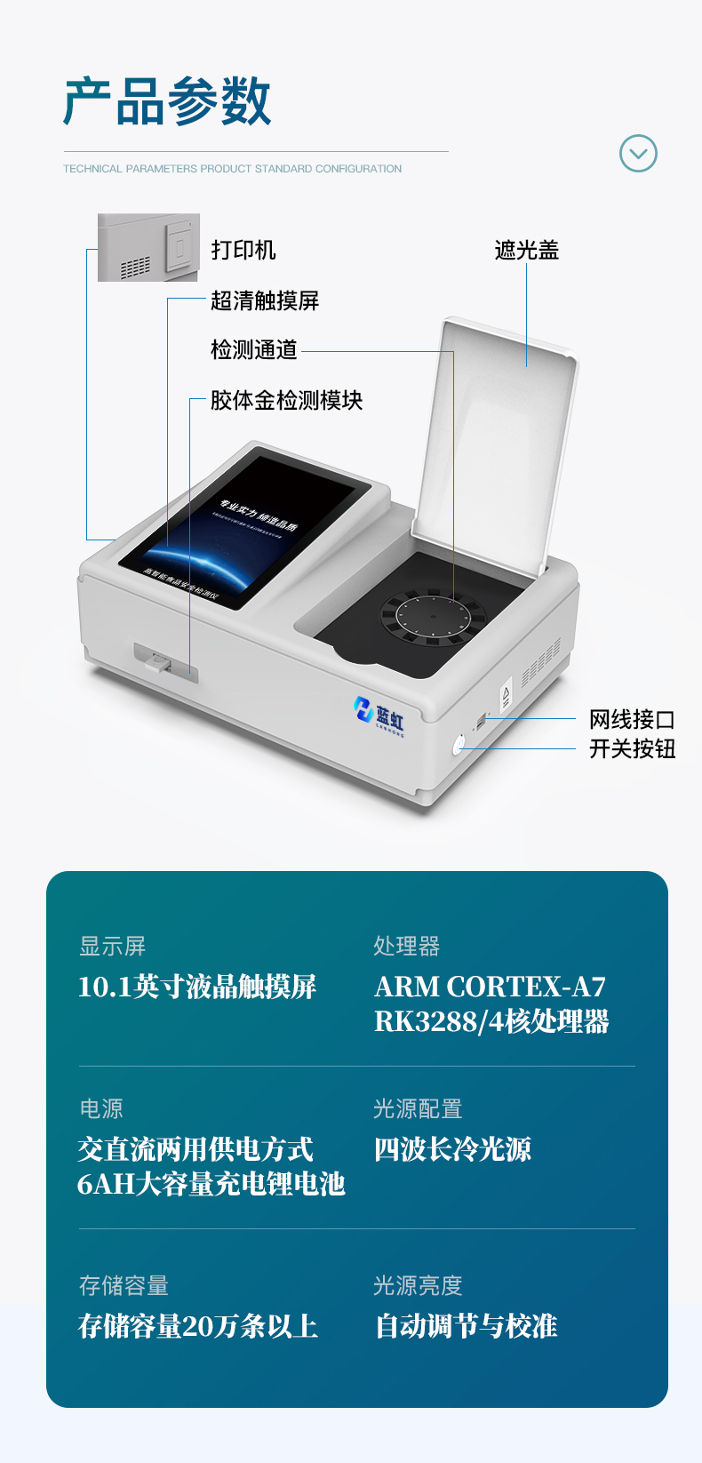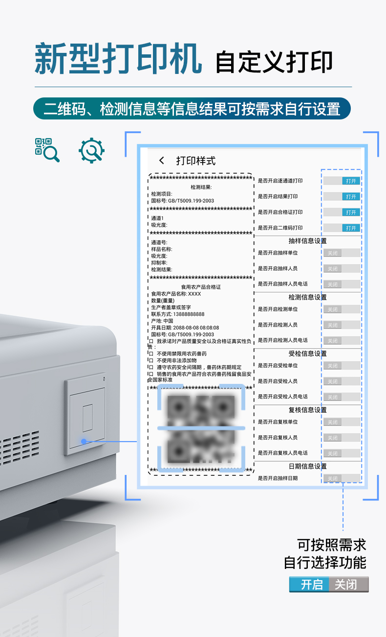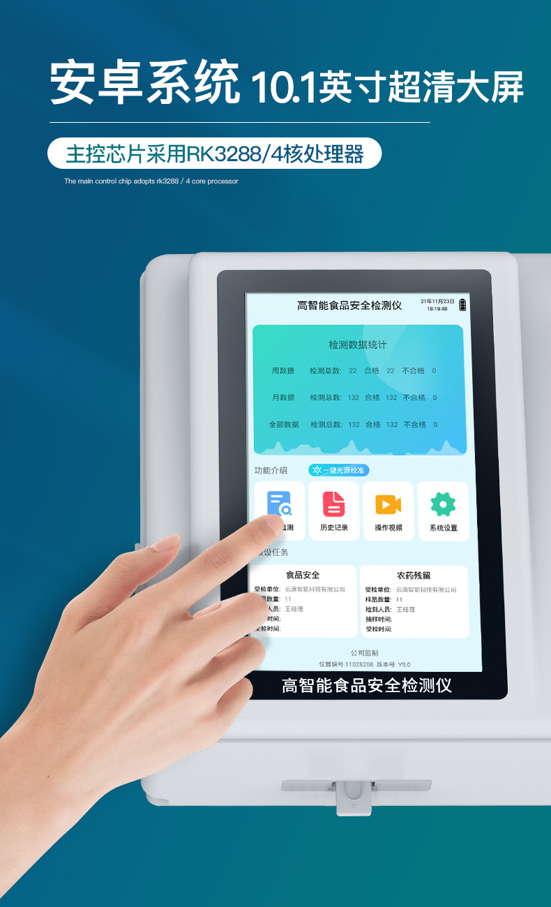 | 儀器采用手提式一體化系統(tǒng)檢測技術(shù),將分光光度模塊、數(shù)字化管理模塊、無線通訊模塊高度集成于一體,支持檢測200種食品安全檢測項(xiàng)目,同時預(yù)留升級檢測方法。 | 儀器檢測模塊標(biāo)準(zhǔn)化、智能化,檢測項(xiàng)目可隨意自由組合。檢測箱體內(nèi)置多個標(biāo)準(zhǔn)檢測單元,檢測模塊可以調(diào)整配置。 | 顯示屏幕:儀器采用10.1英寸豎向液晶觸摸屏顯,搭配運(yùn)行安卓智能操作系統(tǒng),主控芯片采用ARM Cortex-A7,RK3288/4核處理器,主頻1.88Ghz,操作方便,性能更強(qiáng)。 | 檢測通道:≥12通道;采用精密旋轉(zhuǎn)比色池設(shè)計,使用同芯片同光源校準(zhǔn)精度,解決不同光源之間的誤差值,更加準(zhǔn)確**。(1-12通道間誤差0.1%,***:**202022821055.2) | 儀器光源:高精度進(jìn)口四波長冷光源,每個通道均配置 410、520、590、630nm 波長光源,標(biāo)配**的光路切換裝置,專利光路切換功能可實(shí)現(xiàn)64波長,并且所有檢測項(xiàng)目可實(shí)現(xiàn)所有通道同時檢測。 | 設(shè)備可一鍵校準(zhǔn),自動保存校準(zhǔn)數(shù)據(jù),自動對比校驗(yàn),得到精準(zhǔn)光源,采用Android SP存儲數(shù)據(jù),光源數(shù)據(jù)永不丟失,方便每一次使用。 | 通訊接口:配備無線通信模塊、可選配4G(APN)通訊模塊和藍(lán)牙傳輸,同時具有雙USB接口以及RJ45網(wǎng)線接口,可以多方式實(shí)現(xiàn)數(shù)據(jù)保存及數(shù)據(jù)傳輸。 | 存儲方式:支持U盤存儲,標(biāo)準(zhǔn)USB接口,免驅(qū)動安裝。檢測結(jié)果存儲容量20萬條以上,可生成Excel表格進(jìn)行拷貝,并具有登錄保護(hù)功能。 | 智能化操作系統(tǒng): | 1)操作系統(tǒng):儀器可在同一檢測界面自動對應(yīng)相關(guān)檢測通道,一次性選擇1-12個樣品名稱,無需退出界面,節(jié)省操作時間。并可以對每個通道屬性和樣品信息單獨(dú)進(jìn)行編輯,例如送檢單位、人員,檢測人員等,打印時勾選打印顯示。 | 2)數(shù)據(jù)集成系統(tǒng):設(shè)備首頁自動匯總分析檢測數(shù)據(jù),包含:周檢測數(shù)據(jù)、月檢測數(shù)據(jù),全部檢測總數(shù)量,均包含檢測總數(shù),合格數(shù),不合格數(shù),以及相關(guān)柱形分析圖,各項(xiàng)檢測數(shù)據(jù)一目了然,無需電腦查詢,更加快捷直觀。 | 3)數(shù)據(jù)庫系統(tǒng):十幾項(xiàng)數(shù)據(jù)庫分類管理儀器:包含項(xiàng)目類型、項(xiàng)目數(shù)據(jù)、檢測數(shù)據(jù)、歷史記錄、國標(biāo)信息、曲線信息、采樣信息、檢測信息、受檢信息、復(fù)核信息、圖表信息、光源校準(zhǔn)信息、打印樣式信息、樣品庫信息等等,數(shù)據(jù)庫之間互相協(xié)調(diào)聯(lián)動保證數(shù)據(jù)的真實(shí)完整性。同時產(chǎn)品數(shù)據(jù)庫以及歷史檢測記錄支持一鍵檢索功能。 | 4)限量規(guī)判系統(tǒng):具有限量查詢、添加物質(zhì)合規(guī)判定系統(tǒng)。檢測出結(jié)果后,系統(tǒng)自動調(diào)用系統(tǒng)數(shù)據(jù)庫中相關(guān)國標(biāo)進(jìn)行比對判定,客觀顯示判定結(jié)果是否合格。 | 5)項(xiàng)目預(yù)設(shè)系統(tǒng):儀器具有任務(wù)預(yù)設(shè)模塊,一鍵提前預(yù)設(shè),給出方便快捷的新檢測方案,每一個任務(wù)分別可以設(shè)置不同的樣品、批次、編號、來源、備注、抽樣信息、檢測信息、受檢信息、復(fù)核信息等更多信息。樣品送檢時一鍵調(diào)取保存信息,并可多次調(diào)取,大大提高檢測效率。 | 6)數(shù)據(jù)監(jiān)管系統(tǒng):同步對接監(jiān)管平臺,數(shù)據(jù)可局域網(wǎng)和互聯(lián)網(wǎng)數(shù)據(jù)上傳,檢測結(jié)果可選擇直接傳至食品安全監(jiān)管平臺。進(jìn)行區(qū)域食品安全監(jiān)管及大數(shù)據(jù)分析處理與數(shù)據(jù)統(tǒng)計,檢測區(qū)域食品安全長短期動態(tài),達(dá)到食品安全問題預(yù)估、預(yù)警。 | 7)打印系統(tǒng):內(nèi)置全新打印機(jī),新創(chuàng)自定義打印方式,可按需靈活勾選控制:產(chǎn)品合格證(國家農(nóng)業(yè)部標(biāo)準(zhǔn)要求),二維碼,抽樣信息、檢測信息,受檢信息、復(fù)核信息、抽樣日期、檢測日期等信息的打印。 | 供電模式:儀器交直流兩用,直流12V供電,可連接車載電源,可配6ah大容量充電鋰電池,電量可實(shí)時顯示,方便戶外流動測試。 | 儀器加入遠(yuǎn)程升級功能,可定向分客戶分儀器更新,開機(jī)后自動更新,客戶無需任何操作,即可升級全新項(xiàng)目。做到了無需退換機(jī)器即可實(shí)現(xiàn)實(shí)時遠(yuǎn)程升級檢測儀器。 | 設(shè)備尺寸:(長*寬*高)440*300*180mm | 儀器加入遠(yuǎn)程升級功能,可定向分客戶分儀器更新,開機(jī)后自動更新,客戶無需任何操作,即可升級全新項(xiàng)目。做到了無需退換機(jī)器即可實(shí)現(xiàn)實(shí)時遠(yuǎn)程升級檢測儀器。 |