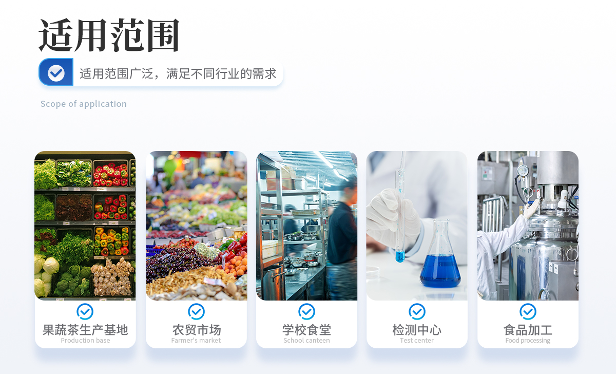 采用酶抑制率比色法對蔬菜、水果、茶葉、糧食、農(nóng)副產(chǎn)品等食品中有機磷和氨基甲酸酯類農(nóng)藥殘留含量進(jìn)行快速準(zhǔn)確的檢測;廣泛應(yīng)用于果蔬茶生產(chǎn)基地和農(nóng)貿(mào)批發(fā)銷售市場現(xiàn)場檢測、農(nóng)業(yè)部門、學(xué)校食堂、市場監(jiān)管局、檢測中心等的安全速測。