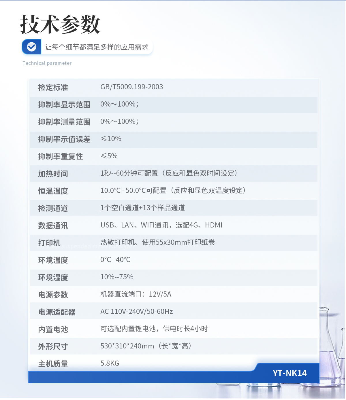 檢定標(biāo)準(zhǔn):GB/T5009.199-2003 抑制率顯示范圍:0%~100%; 抑制率測量范圍:0%~100%; 抑制率示值誤差:≤10% 抑制率重復(fù)性:≤5% 加熱時間:1秒--60分鐘可配置(反應(yīng)和顯色雙時間設(shè)定) 恒溫溫度:10.0℃--50.0℃可配置(反應(yīng)和顯色雙溫度設(shè)定) 檢測通道:1個空白通道+13個樣品通道 數(shù)據(jù)通訊:USB、LAN、WIFI通訊,選配4G、HDMI 打印機:熱敏打印機、使用55x30mm打印紙卷 環(huán)境溫度:0℃--40℃ 環(huán)境濕度:10%--75% 電源參數(shù):機器直流端口:12V/5A 電源適配器:AC 110V-240V/50-60Hz 內(nèi)置電池:可選配內(nèi)置鋰電池,供電時長4小時 外形尺寸:530*310*240mm(長*寬*高) 主機質(zhì)量:5.8KG