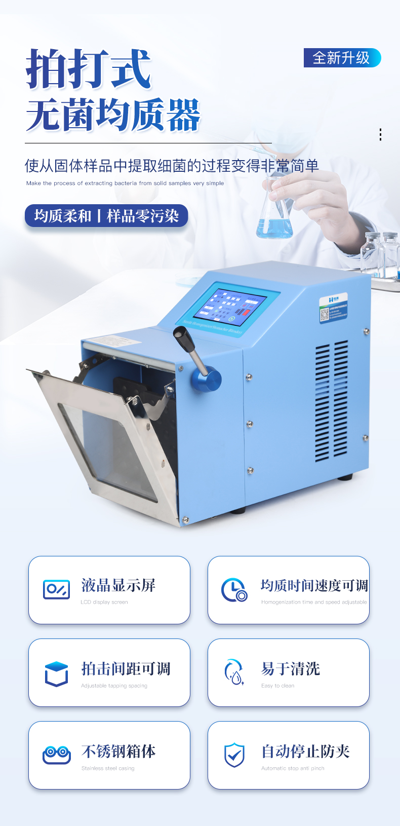 產品簡介:無菌均質器使從固體樣品中提取細菌的過程變得非常簡單,只需將樣品和稀釋液加入到無菌的樣品袋中,然后將樣品袋放入拍擊式均質器中即可完成樣品的處理。有效地分離被包含在固體樣品內部和表面的微生物均一樣品,確保無菌袋中混合全部的樣品。處理后的樣品溶液可以直接進行取樣和分析,沒有樣品的變化和交叉污染的危險。