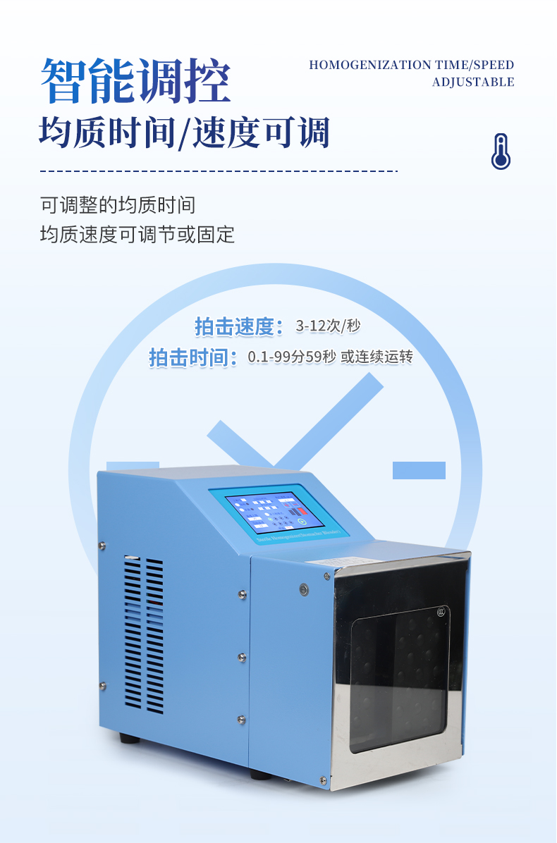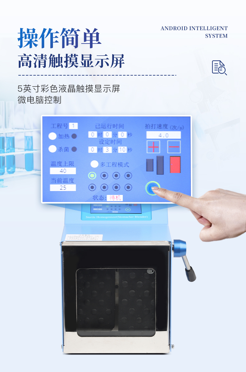 ●5英寸液晶顯示屏。 ●可儲存三組工作程序。 ●可調整的均質時間。 ●均質速度可調節(jié)或固定。 ●拍擊器可調整前后距離。 ●無菌一次性濾袋,保證衛(wèi)生。 ●全開啟式門,易于清洗。 ●玻璃透明窗口易于觀察 。 ●樣品與均質儀無接觸,如無樣品泄露則不需進行系統清洗. ●均質柔和、樣品零污染、無損傷、不升溫、不需要滅菌處理,不需洗刷器皿。