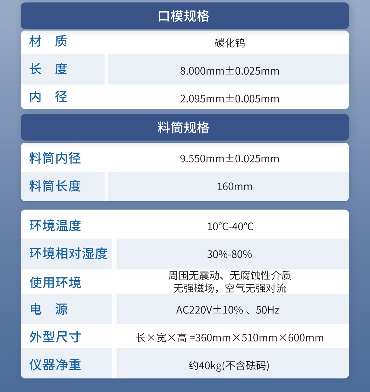 機臺設(shè)計標(biāo)準:符合ASTM-D1238、D3364、ISO-1133、JIS-K7210標(biāo)準要求。