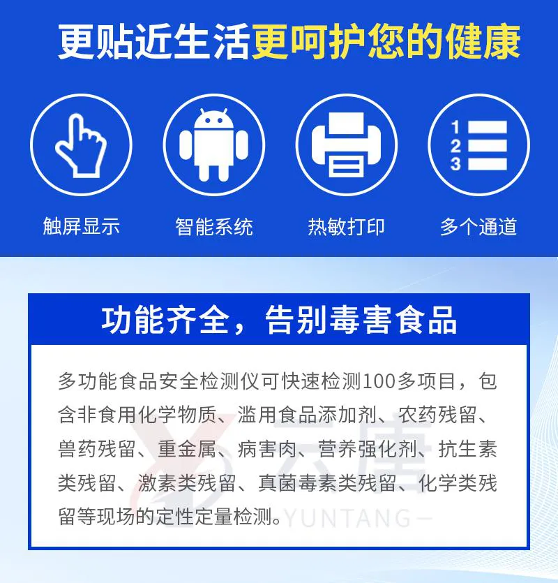 多功能食品安全檢測儀可快速檢測60多項目,包含非食用化學物質(zhì)、濫用食品添加劑、農(nóng)藥殘留、獸藥殘留、重金屬、病害肉、營養(yǎng)強化劑、抗生素類殘留、激素類殘留、真菌毒素類殘留、化學類殘留等現(xiàn)場的定性定量檢測。