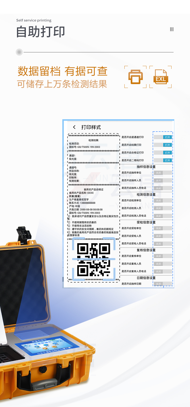 5、配備新一代嵌入式熱敏打印機(jī),可選擇手動(dòng)打印或者自動(dòng)打印,檢測(cè)完成可自動(dòng)打印檢測(cè)報(bào)告和二維碼。