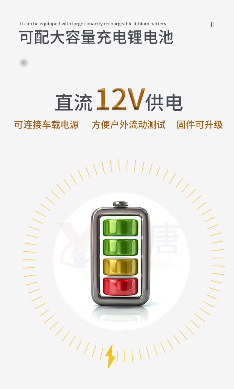 2、直流12V供電,可連接車(chē)載電源,可配6ah大容量充電鋰電池,方便戶(hù)外流動(dòng)測(cè)試。