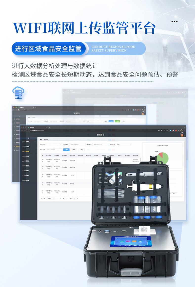 4、儀器帶有監(jiān)管平臺(tái),數(shù)據(jù)可局域網(wǎng)和互聯(lián)網(wǎng)數(shù)據(jù)上傳,檢測(cè)結(jié)果直接傳至食品安全監(jiān)管平臺(tái)。進(jìn)行區(qū)域食品安全監(jiān)管及大數(shù)據(jù)分析處理與數(shù)據(jù)統(tǒng)計(jì),檢測(cè)區(qū)域食品安全長(zhǎng)短期動(dòng)態(tài),達(dá)到食品安全問(wèn)題預(yù)估、預(yù)警