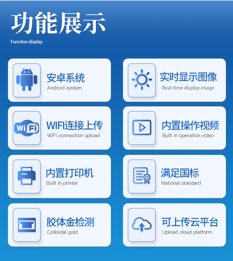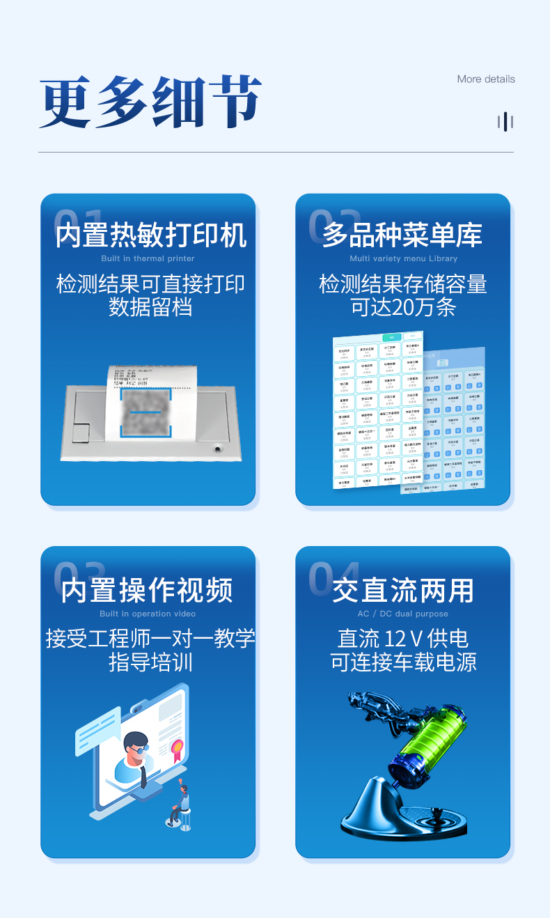| 儀器采用10.1英寸液晶觸摸屏顯,搭配運(yùn)行安卓智能操作系統(tǒng),主控芯片采用ARM Cortex-A7,RK3288/4核處理器,主頻1.88Ghz,運(yùn)轉(zhuǎn)速度更快速,性能更強(qiáng)。 | 儀器功能包括:膠體金檢測(cè)模塊、數(shù)字化管理模塊、無(wú)線通訊模塊等,可以滿足同一軟件下實(shí)現(xiàn)所有檢測(cè)項(xiàng)目的檢測(cè),并在同一窗口展示檢測(cè)結(jié)果。 | 一體化便攜式快檢設(shè)備,采用交直流兩用供電方式,可連接車載電源,配備6ah大容量充電鋰電池,可以滿足現(xiàn)場(chǎng)及流動(dòng)檢測(cè)使用的需求。儀器尺寸:43×35×20cm, 主機(jī)凈重:5.1kg | 系統(tǒng)自帶數(shù)據(jù)集成模塊,設(shè)備首頁(yè)自動(dòng)統(tǒng)計(jì)檢測(cè)數(shù)據(jù)包含:周檢測(cè)數(shù)據(jù)、月檢測(cè)數(shù)據(jù),全部檢測(cè)總數(shù)量,均包含檢測(cè)總數(shù),合格數(shù),不合格數(shù),以及相關(guān)柱形分析圖,對(duì)各項(xiàng)檢測(cè)數(shù)據(jù)清晰掌握,無(wú)需電腦查詢,更加快捷直觀。 | 儀器具有任務(wù)預(yù)設(shè)模塊,可在樣品送檢前提前預(yù)設(shè)樣品名稱、檢測(cè)指標(biāo)、送檢單位等信息,樣品送檢時(shí)一鍵調(diào)取保存信息,檢測(cè)更加方便快捷。 | 膠體金檢測(cè)模塊: 直插式自動(dòng)掃描方式,可實(shí)時(shí)顯示金標(biāo)卡實(shí)時(shí)圖像,系統(tǒng)自動(dòng)分析并呈現(xiàn)出CT曲線圖,CT線自動(dòng)識(shí)別,無(wú)需手動(dòng)調(diào)整,完成檢測(cè)后自動(dòng)退出檢測(cè)卡。 結(jié)果判定線可修改,對(duì)照值標(biāo)定值可保存,斷電不丟失數(shù)據(jù)。 兼容市場(chǎng)上其他膠體金卡,使用耗材不受限制,極大增強(qiáng)用戶使用體驗(yàn)。 | 儀器檢測(cè)系統(tǒng)擁有龐大數(shù)據(jù)庫(kù),并且構(gòu)建了完善的檢索、修訂功能。食品庫(kù)涵蓋多種樣品名稱,可按需添加或刪除、編輯樣品名稱;產(chǎn)品數(shù)據(jù)庫(kù)以及歷史檢測(cè)記錄支持一鍵檢索功能。 | 系統(tǒng)打印自定義化,打印格式多樣化,產(chǎn)品合格證(國(guó)家標(biāo)準(zhǔn)要求),二維碼,抽樣信息、檢測(cè)信息,受檢信息、復(fù)核信息、抽樣日期、檢測(cè)日期等信息結(jié)果,可按需求自行設(shè)置打印內(nèi)容。 | A4紙版本報(bào)告打印功能(可選配):設(shè)備擁有兩種結(jié)果展示方式,可以自動(dòng)生成A4打印模板和小票打印模板兩種樣式,可通過(guò)WiFi及網(wǎng)線等方式鏈接外置打印機(jī)可進(jìn)行打印 | 儀器具有 wifi 聯(lián)網(wǎng)上傳、RJ45網(wǎng)線連接功能,可以快速上傳數(shù)據(jù)。同步對(duì)接監(jiān)管平臺(tái),數(shù)據(jù)可局域網(wǎng)和互聯(lián)網(wǎng)數(shù)據(jù)上傳,檢測(cè)結(jié)果直接傳至食品安全監(jiān)管平臺(tái)。進(jìn)行區(qū)域食品安全監(jiān)管及大數(shù)據(jù)分析處理與數(shù)據(jù)統(tǒng)計(jì),檢測(cè)區(qū)域食品安全長(zhǎng)短期動(dòng)態(tài),達(dá)到食品安全問(wèn)題預(yù)估、預(yù)警。 | 設(shè)備支持U盤存儲(chǔ),標(biāo)準(zhǔn)USB接口,免驅(qū)動(dòng)安裝。檢測(cè)結(jié)果存儲(chǔ)容量20萬(wàn)條以上,可生成Excel表格,進(jìn)行一鍵拷貝,并具有登錄保護(hù)功能,可設(shè)置用戶名及密碼,規(guī)范不同人員操作權(quán)限,防止非工作人員操作,并且可以進(jìn)行重新校準(zhǔn)、鎖定、恢復(fù)出廠設(shè)置功能。儀器固件可升級(jí),后期檢測(cè)項(xiàng)目可擴(kuò)充。 | 儀器具備遠(yuǎn)程升級(jí)功能,可定向分客戶分儀器更新,開(kāi)機(jī)后自動(dòng)更新,并可持續(xù)性免費(fèi)更新系統(tǒng)版本,無(wú)需像傳統(tǒng)產(chǎn)品返廠更新,節(jié)省時(shí)間及人力成本并避免了物流運(yùn)輸返廠升級(jí)導(dǎo)致設(shè)備損壞的潛在風(fēng)險(xiǎn)。 |