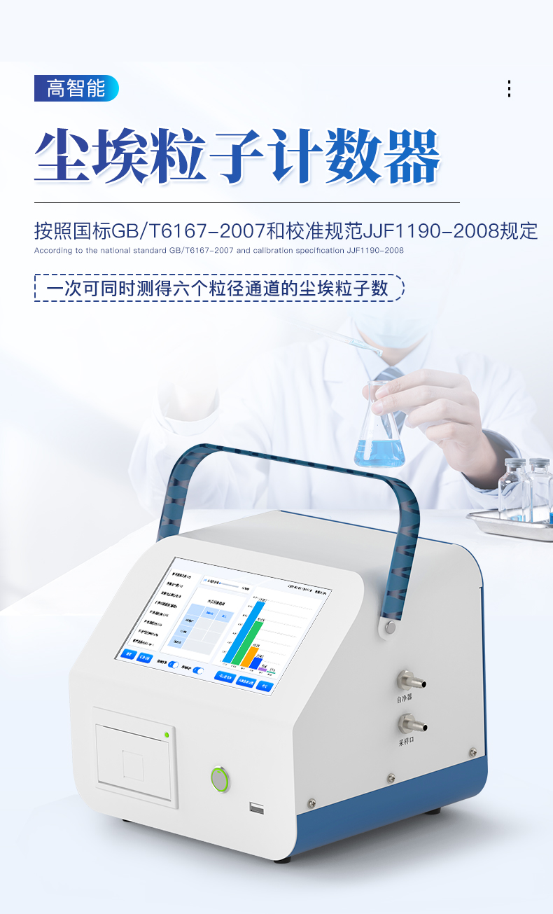智能塵埃粒子計(jì)數(shù)器,其置信度測(cè)量檢定標(biāo)準(zhǔn)按照國(guó)標(biāo)GB/T6167-2007和校準(zhǔn)規(guī)范JJF1190-2008規(guī)定的條件,對(duì)凈化級(jí)別進(jìn)行自動(dòng)判斷。一次采樣可同時(shí)測(cè)得六個(gè)粒徑通道的塵埃粒子數(shù),并同時(shí)顯示六個(gè)粒徑通道粒子的數(shù)目及其變化情況。