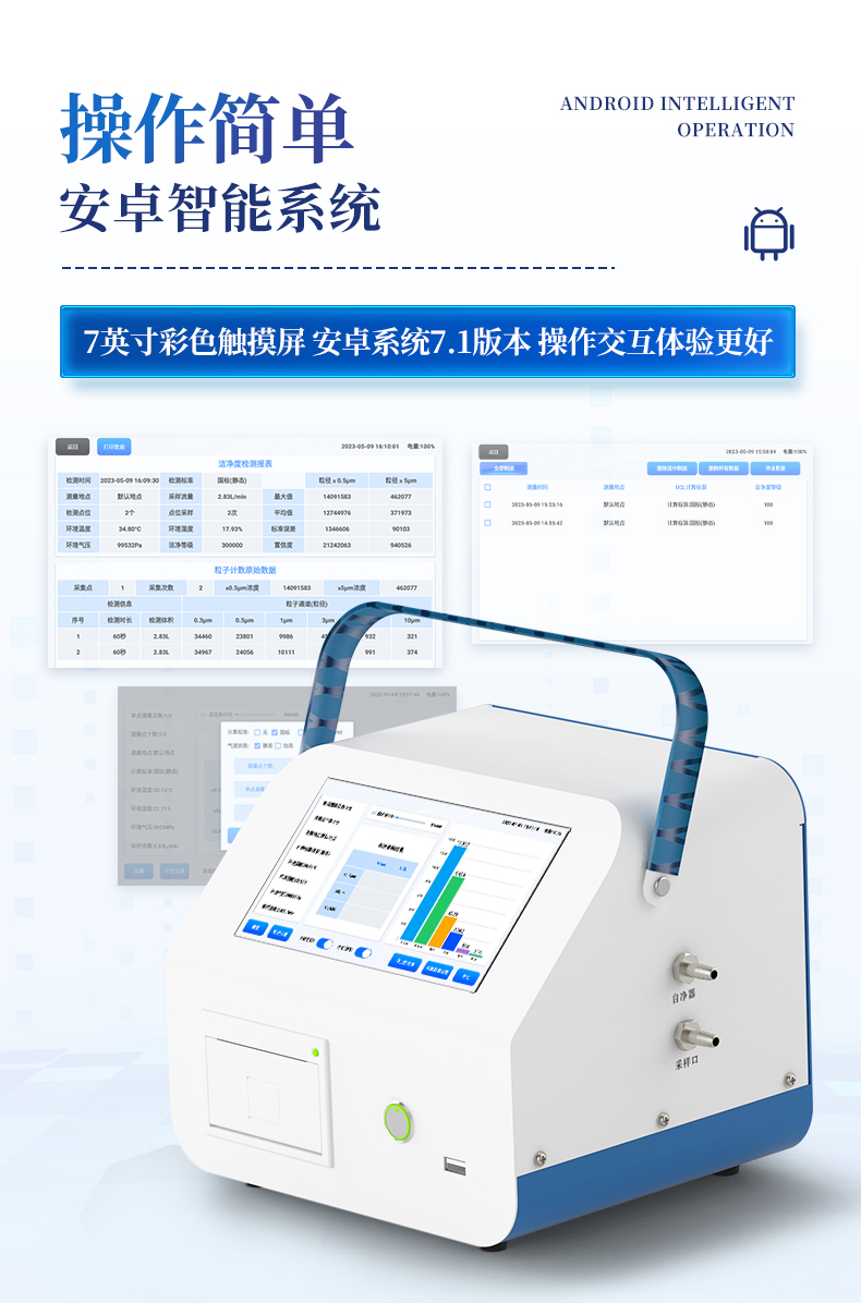1、安卓系統(tǒng)7.1版本,操作交互體驗(yàn)更好。 2、內(nèi)置溫濕度傳感器、環(huán)境氣壓傳感器 3、核心部件光散射傳感器明顯消除腔體的雜散光,信噪比大為提高。從而使測(cè)量更準(zhǔn)確更可靠。 4、按95%置信度(UCL)計(jì)算,計(jì)數(shù)結(jié)果可換算成m3和ft3 5、依照凈化級(jí)別劃分和規(guī)定,自動(dòng)判定凈化級(jí)別,使用便利。 6、帶審計(jì)追蹤功能,可查詢(xún)、可追溯、可控制,符合FDA 21CFR PART11規(guī)范 7、支持wifi、藍(lán)牙傳輸,數(shù)據(jù)可無(wú)線上傳;同時(shí)支持U盤(pán)拷貝數(shù)據(jù),免驅(qū)動(dòng)插拔。 8、配置監(jiān)管平臺(tái),檢測(cè)結(jié)果可直接無(wú)線傳至平臺(tái),進(jìn)行潔凈度長(zhǎng)短期分析,輔助管理。 9、內(nèi)置新一代高速熱敏打印機(jī),可選擇所需要打印的粒徑通道,靈活打印結(jié)果。 10、交直流兩用,內(nèi)置充電鋰電池,環(huán)保耐用可支持連續(xù)采樣6小時(shí)以上。 11、便捷簡(jiǎn)易伸縮式云臺(tái)支架,安裝采樣操作更加方便。