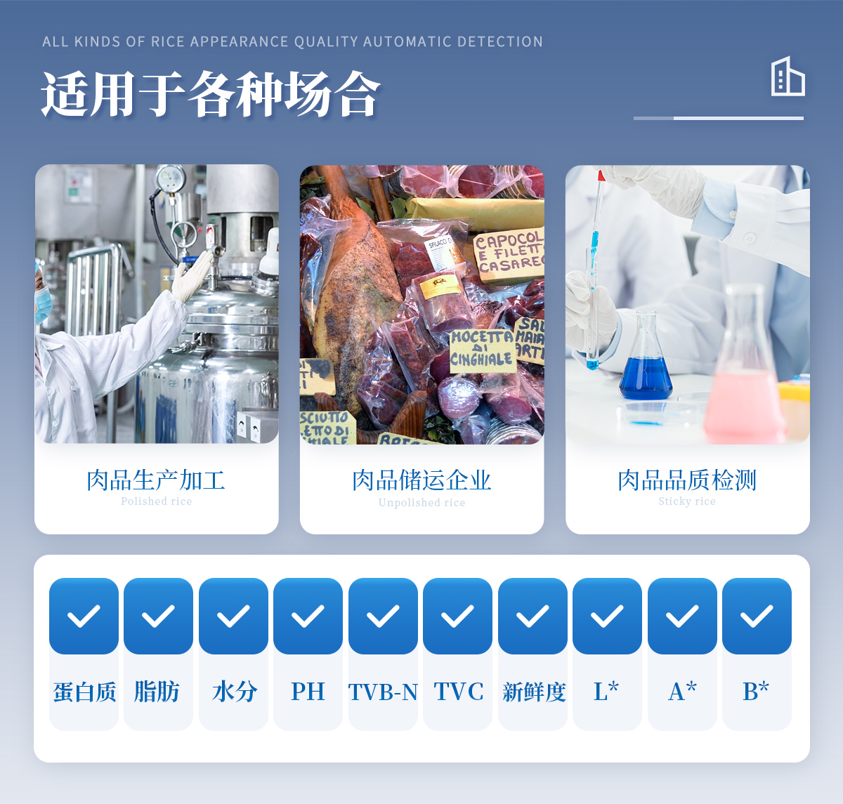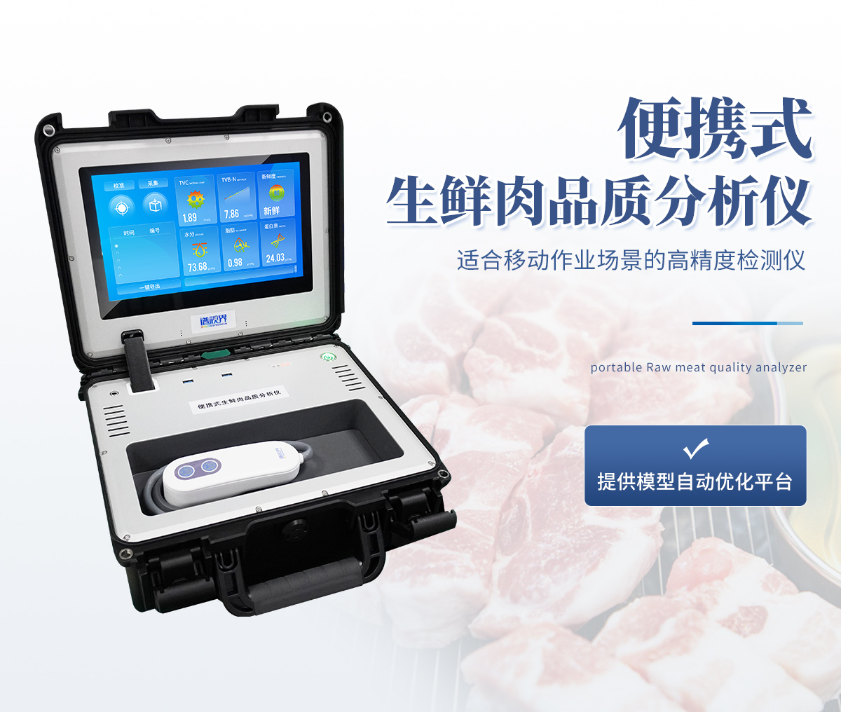 可用于檢測生鮮肉的蛋白質(zhì)、脂肪、水分、pH、TVC、TVB-N、新鮮度、L*、A*、B*等品質(zhì)參數(shù)。配備手提箱式防水減震外殼、大尺寸觸控屏幕并內(nèi)置大容量電池,可一鍵自動校準,是一款適合移動作業(yè)場景的高精度生鮮肉品質(zhì)檢測儀,其可用于生鮮肉及肉品生產(chǎn)、加工、儲運企業(yè)、肉品品質(zhì)監(jiān)管部門等。