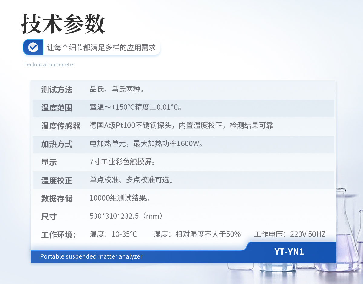 測試方法:品氏、烏氏兩種。 溫度范圍:室溫~+150°C精度±0.01°C。 溫度傳感器:德國A級Pt100不銹鋼探頭,內(nèi)置溫度校正,檢測結(jié)果可靠。 加熱方式:電加熱單元,**加熱功率1600W。 顯示:7寸工業(yè)彩色觸摸屏。 溫度校正:單點校準、多點校準可選。 數(shù)據(jù)存儲:10000組測試結(jié)果。 尺寸:530*310*232.5(mm) 工作環(huán)境: 溫 度:10-35℃ 濕 度:相對濕度不大于50% 工作電壓:220V 50HZ