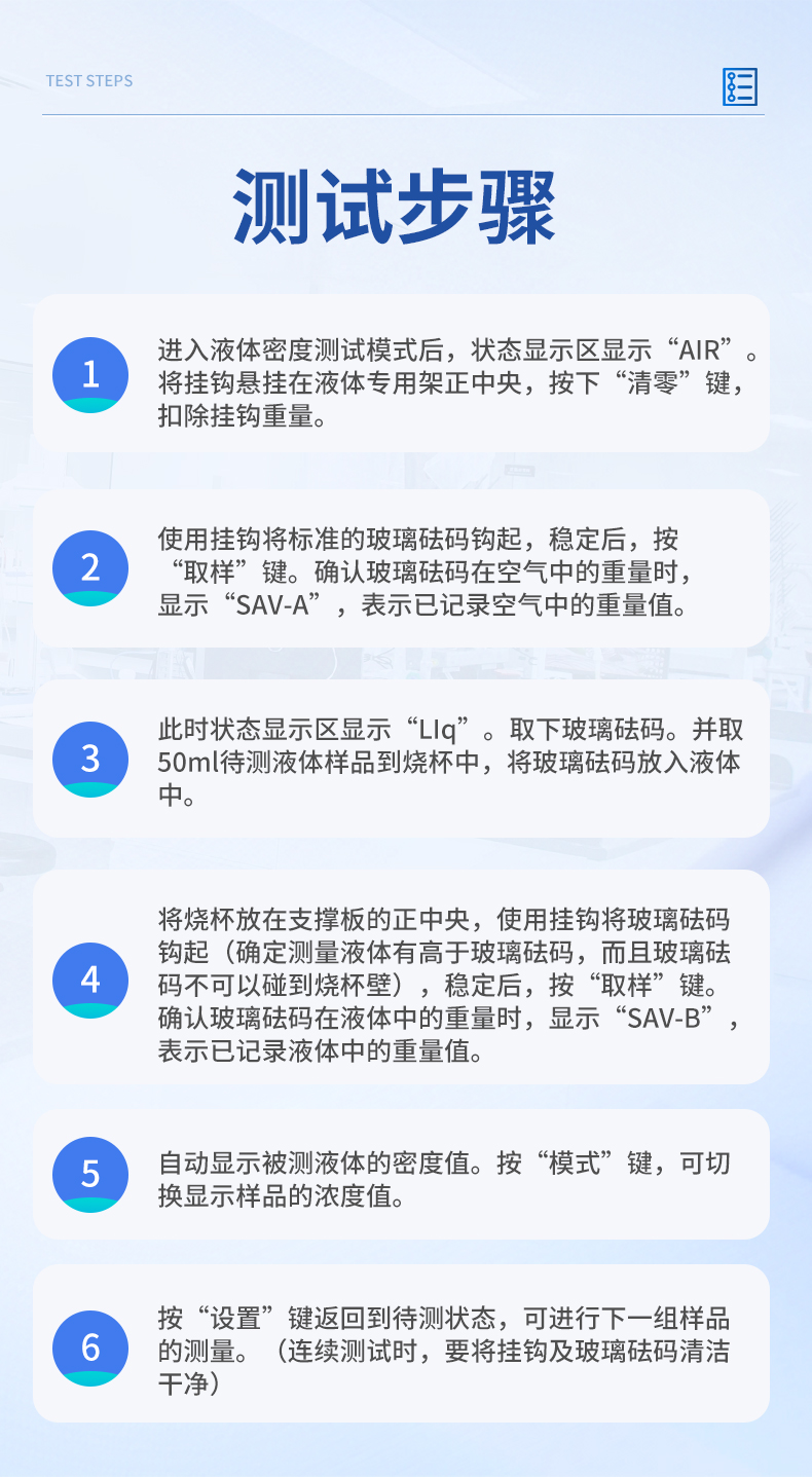 | 1、進(jìn)入液體密度測試模式后,狀態(tài)顯示區(qū)顯示“AIR”。 將掛鉤懸掛在液體專用架正中央,按下“清零”鍵,扣除掛鉤重量。 | 2、使用掛鉤將標(biāo)準(zhǔn)的玻璃砝碼鉤起,穩(wěn)定后,按“取樣”鍵。確認(rèn)玻璃砝碼在空氣中的重量時,顯示“SAV-A”,表示已記錄空氣中的重量值。 | 3、此時狀態(tài)顯示區(qū)顯示“LIq”。取下玻璃砝碼。并取50ml待測液體樣品到燒杯中,將玻璃砝碼放入液體中。 | 4、將燒杯放在支撐板的正中央,使用掛鉤將玻璃砝碼鉤起(確定測量液體有高于玻璃砝碼,而且玻璃砝碼不可以碰到燒杯壁),穩(wěn)定后,按“取樣”鍵。確認(rèn)玻璃砝碼在液體中的重量時,顯示“SAV-B”,表示已記錄液體中的重量值。 | 5、自動顯示被測液體的密度值。按“模式”鍵,可切換顯示樣品的濃度值。 | 7、按“設(shè)置”鍵返回到待測狀態(tài),可進(jìn)行下一組樣品的測量。(連續(xù)測試時,要將掛鉤及玻璃砝碼清潔干凈) | 儀器尺寸:195*220*190mm | 包裝尺寸:430*200*360mm | 包裝重量:4kg |