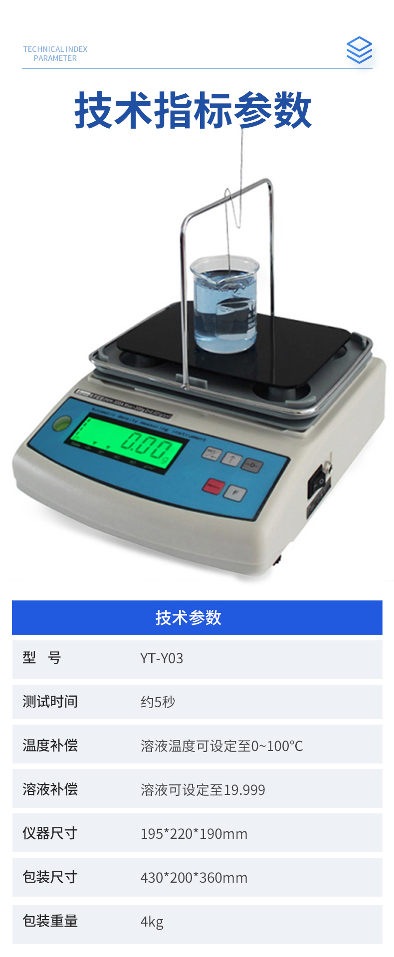 | YT-Y01 稱重范圍:0.01-300g 稱重精度:0.01g 密度精度:0.001g/cm3 | YT-Y02 稱重范圍:0.01-600g 稱重精度:0.01g 密度精度:0.001g/cm3 | YT-Y03 稱重范圍:0.005-300g 稱重精度:0.005g 密度精度:0.0001g/cm3 | 測試種類 化工溶液、化工助劑、現(xiàn)代能源、石油燃燒、藥劑、油漆涂料、瀝青、食用油等各種液體 | 測試時間 約5秒 | 顯示值 密度、體積 | 溫度補(bǔ)償 溶液溫度可設(shè)定至0~100℃ | 溶液補(bǔ)償 溶液可設(shè)定至19.999 |