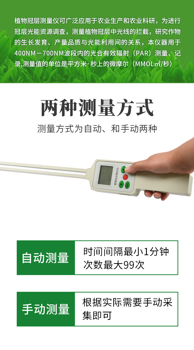 魚眼鏡頭可以伸入至冠層中:鏡頭安裝在搖臂一端,由于小巧和帶有測(cè)量桿,可以方便地水平向前或垂直向上伸入到冠層不同高度處,快速地進(jìn)行分層測(cè)量,測(cè)出群體內(nèi)光透過率和